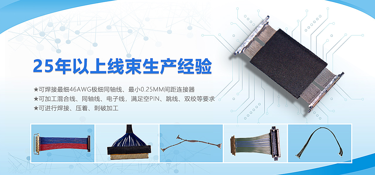 公司主營極細同軸線束、車載信號線束、航空頭線束、RF射頻線、電子接插件、微動開關等